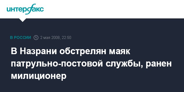 Ростов-на-Дону. 2 мая. ИНТЕРФАКС-ЮГ - Неизвестные обстреляли маяк патрульно-постовой службы в городе Назрани, один из сотрудников милиции получил ранение, сообщили агентству "Интерфакс-Юг" в штабе временной группировки войск.
