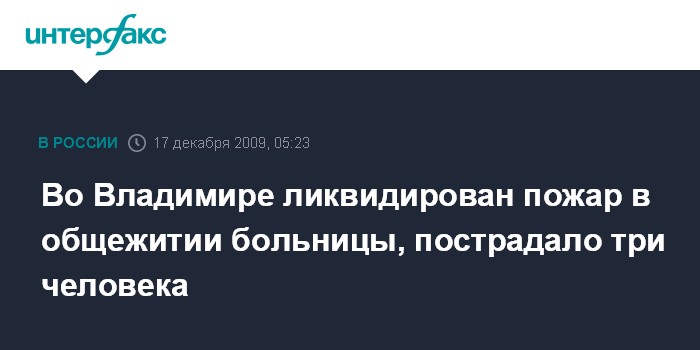 Москва. 17 декабря. ИНТЕРФАКС - На втором этаже больничного общежития Владимира на Судогодской улице произошел пожар, сообщила "Интерфаксу" сотрудник пресс-службы Центрального регионального центра МЧС Людмила Мартынова.