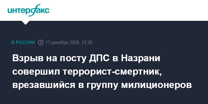 Москва. 17 декабря. INTERFAX.RU - Взрыв на посту ДПС в Назрани на федеральной трассе "Кавказ" совершил террорист-смертник на автомобиле "Лада Приора" черного цвета. "Около 13:00 мск в момент, когда на так называемом Экажевском кругу, где расположен пост ДПС, милиционеры проводили спецрейдовые мероприятия, в них врезалась на скорости автомашина "Лада Приора" черного цвета, после чего прогремел мощный взрыв", - сообщил агентству "Интерфакс-Юг" источник в МВД Ингушетии.