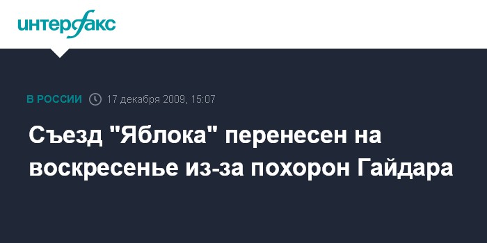 Москва. 17 декабря. INTERFAX.RU - Партия "Яблока" в связи с похоронами в субботу экономиста и политика Егора Гайдара перенесла свой съезд на воскресенье. "Многие наши члены хотят попрощаться с Егором Тимуровичем, близким которого мы выражаем самые глубокие соболезнования. Поэтому наш съезд состоится в воскресенье", - сообщил "Интерфаксу" пресс-секретарь "Яблока" Игорь Яковлев. Вместе с тем, он отметил, что повестка дня съезда останется прежней - прежде всего партия планирует обсудить, как лучше действовать в ситуации, сложившейся в России.