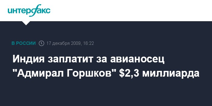 Москва. 17 декабря. INTERFAX.RU - Россия и Индия согласовали окончательную стоимость работ по ремонту и модернизации авианесущего крейсера "Адмирал Горшков", сообщает индийское информагентство IANS. "Индия заплатит России за авианосец $2,3 млрд", - сообщает IANS.
