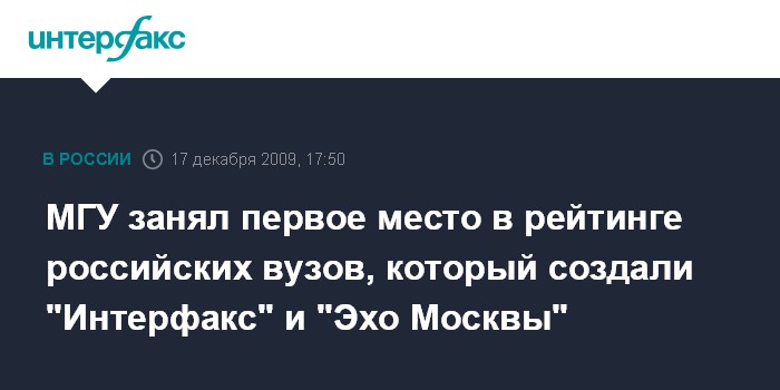 Как сообщалось ранее, международная информационная группа "Интерфакс" совместно с радиостанцией "Эхо Москвы" приступила к реализации нового совместного проекта - формированию рейтингов высших учебных заведений Российской Федерации. В октябре 2009 года в результате конкурсных процедур ЗАО "Информ-Инвест" - дочерняя структура "Интерфакса" - подписала государственный контракт с Федеральным агентством по образованию РФ на разработку основ независимой системы оценки и формирования рейтингов российских вузов.