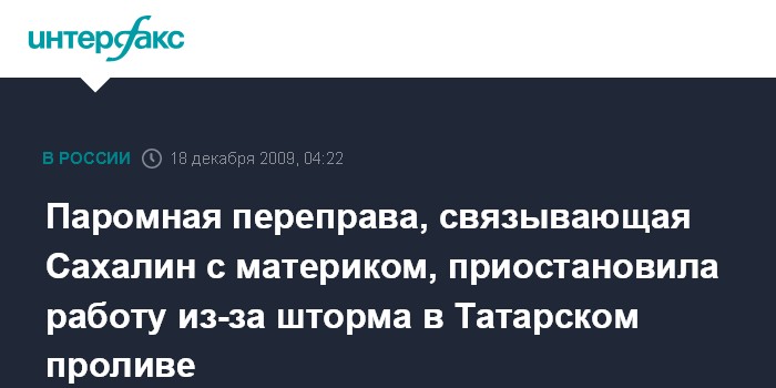 Южно-Сахалинск. 18 декабря. ИНТЕРФАКС - ДАЛЬНИЙ ВОСТОК - Паромная переправа Ванино-Холмск, связывающая Сахалин с материком, приостановила работу из-за сильного шторма в море.