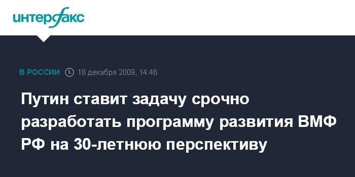 Москва. 18 декабря. INTERFAX.RU - Премьер-министр РФ Владимир Путин заявляет о необходимости разработки долгосрочной программы развития военного кораблестроения. "Абсолютно необходимо в самые сжатые сроки разработать долгосрочную программу его (военного кораблестроения - ИФ) развития, она должна опираться на объективные потребности флота, учитывать задачи, которые перед нами стоят сегодня или на базе прогноза возникнут в перспективе не менее чем 30 лет. Это как минимум", - заявил Путин на совещании по вопросам оборонно-промышленного комплекса в пятницу.