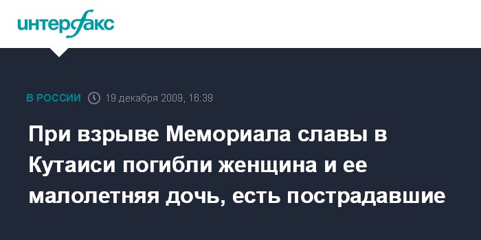 Москва. 19 декабря. INTERFAX.RU - Согласно уточненной информации департамента по чрезвычайным ситуациям МВД Грузии, на которую ссылаются грузинские СМИ, во время взрыва в субботу в городе Кутаиси Мемориала славы погибли женщина и ее 8-летняя дочь Джинчарадзе.