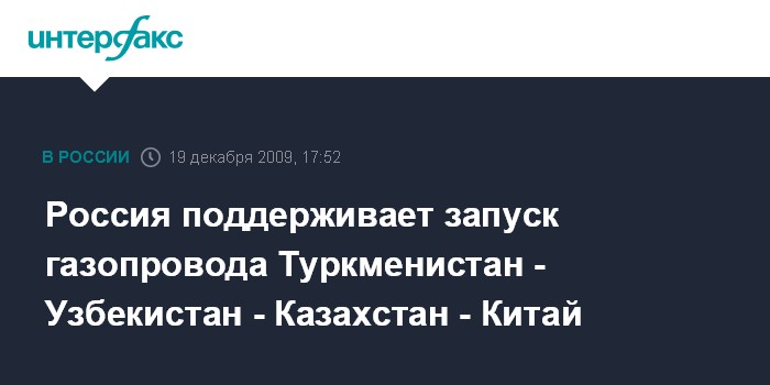 Москва. 19 декабря. INTERFAX.RU - Россия одобряет и поддерживает осуществленный на этой неделе запуск в эксплуатацию газопровода Туркменистан - Узбекистан -Казахстан - Китай, заявил первый вице-премьер РФ Игорь Шувалов.