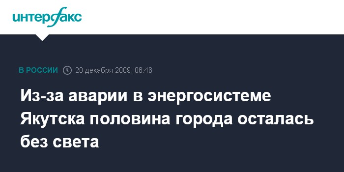 Якутск. 20 декабря. ИНТЕРФАКС-ДАЛЬНИЙ ВОСТОК - В результате аварии на одной из энергоподстанций Якутска в воскресенье утром примерно половина города осталась без света, сообщил агентству "Интерфакс-Дальний Восток" заместитель главы горадминистрации Сергей Визир.