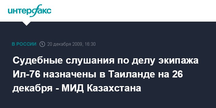 Астана. 20 декабря. INTERFAX.RU - Вторые судебные слушания в отношении арестованного в Бангкоке экипажа самолета Ил-76, по предварительным данным, назначены на 26 декабря, сообщили агентству "Интерфакс-Казахстан" в воскресенье в пресс-службе МИД Казахстана. В пресс-службе также добавили, что представители казахстанской дипломатической миссии в Таиланде ежедневно встречаются с арестованными гражданами республики, передают им необходимые лекарства, витамины и питание.