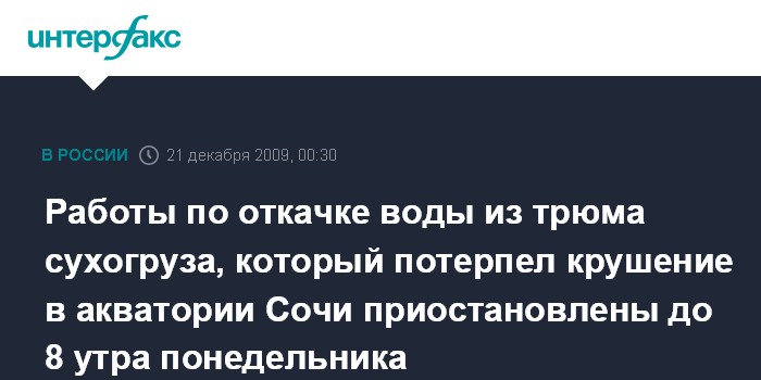 Работы по откачке воды из трюма сухогруза, который потерпел крушение в акватории Сочи приостановлены до 8 утра понедельника