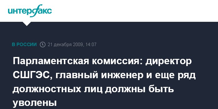 Москва. 21 декабря. INTERFAX.RU - Парламентская комиссия по расследованию аварии на Саяно-Шушенской ГЭС рекомендуют освободить от занимаемых должностей нескольких представителей руководства гидроэлектростанции, включая директора, главного инженера и начальника службы мониторинга оборудования.