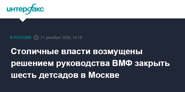 Москва. 21 декабря. INTERFAX.RU - Власти Москвы возмущены приказом руководства ВМФ России о ликвидации шести принадлежащих ему детских садов, расположенных на территории столицы, заявили "Интерфаксу" в пресс-службе мэра и правительства города в понедельник.