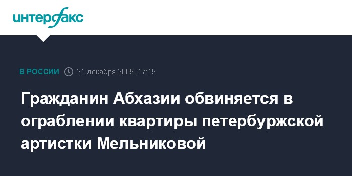 Москва. 21 декабря. INTERFAX.RU - Следственное управление СКП РФ по Петербургу предъявило гражданину Абхазии Нодару Мелая обвинение в ограблении квартиры заслуженной артистки РФ Анастасии Мельниковой, сообщает сайт управления в понедельник.