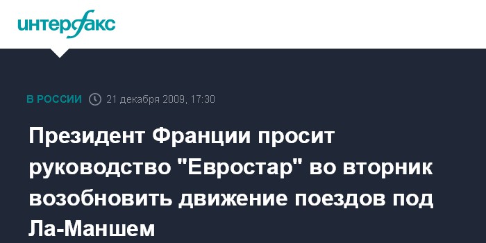 Москва. 21 декабря. INTERFAX.RU - Президент Франции Николя Саркози обратился с просьбой к руководителям компании "Евростар", чтобы они возобновили движение поездов по туннелю под Ла-Маншем уже во вторник 22 декабря, сообщило в понедельник агентство ЭФЭ.