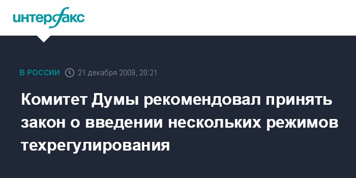 Москва. 21 декабря. INTERFAX.RU - Комитет Госдумы по экономической политике и предпринимательству в понедельник рекомендовал принять во втором и третьем чтениях президентские поправки в закон о техническом регулировании, предусматривающие возможность введения в РФ нескольких режимов техрегулирования.