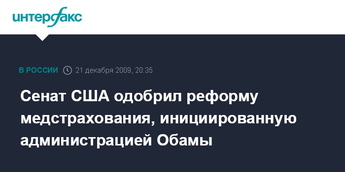 Москва. 21 декабря. INTERFAX.RU - Сенат США в понедельник проголосовал за законопроект о реформе медицинского страхования, одобрив его 60 голосами против 40.
