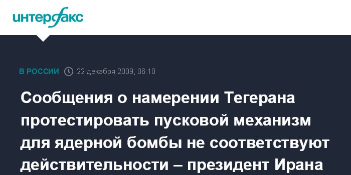 Лондон. 22 декабря. ИНТЕРФАКС - Иранский президент Махмуд Ахмадинежад заявил, что документ, свидетельствующий о намерениях Тегерана испытать пусковое устройство для ядерной бомбы, сфабрикован США, сообщает Би-би-си.