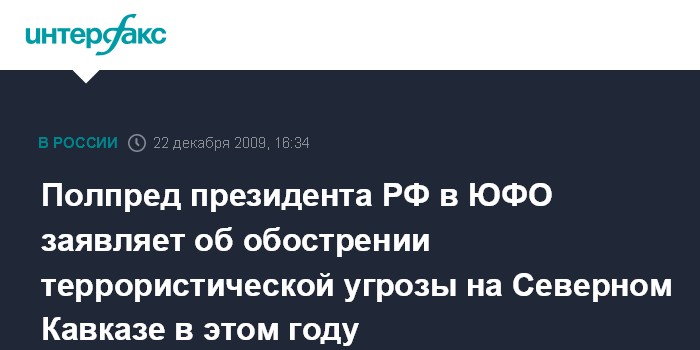 Москва. 22 декабря. INTERFAX.RU - Террористическая угроза на Северном Кавказе с начала этого года значительно обострилась, увеличившись почти на треть по сравнению с прошлым годом, заявил полномочный представитель президента РФ в Южном федеральном округе Владимир Устинов. "За девять месяцев 2009 г., по сравнению с аналогичным периодом прошлого года, почти на 30 процентов возросло число нападений боевиков и достигло 786", - сообщил Устинов в ходе встречи с членами Совета Федерации от регионов ЮФО во вторник в Москве. Он отметил также, что с начала года количество погибших и раненых военнослужащих и сотрудников правоохранительных органов, а также гражданских лиц, возросло с 914 до 1263 человек. "Наиболее высокий уровень террористической активности отмечен в Ингушетии, Дагестане и Чеченской республике", - подчеркнул полпред.