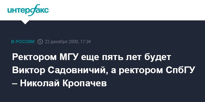 Москва. 22 декабря. INTERFAX.RU - Президент РФ Дмитрий Медведев назначил Виктора Садовничего на должность ректора МГУ им. Ломоносова, а Николая Кропачева - ректора СПбГУ.