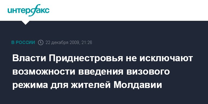 Москва. 22 декабря. INTERFAX.RU - Приднестровье готово ввести визовый режим для жителей Молдавии в случае, если молдавские правоохранительные органы не прекратят изъятие загранпаспортов у граждан России и Украины, проживающих на левом берегу Днестра и не имеющих вида на жительство в Молдавии. "Предупреждаю, в ответ мы введем визовый режим для молдавских граждан. Согласен, что это дикость. Но что делать?" - заявил во вторник президент непризнанной Приднестровской Молдавской республики Игорь Смирнов во время встречи с главой миссии ОБСЕ в Молдавии Филиппом Ремлером.