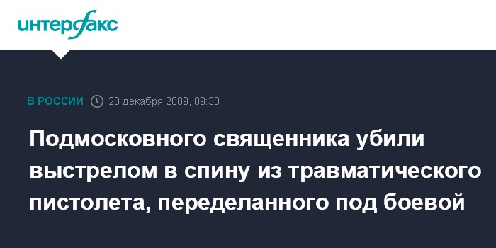 Москва. 23 декабря. INTERFAX.RU - Протоиерей Александр Филиппов был убит из травматического пистолета, переделанного под боевой, сообщил "Интерфаксу" в среду источник в правоохранительных органах. По данным источника, убийца "выстрелил в спину Филиппову из травматического пистолета, переделанного под стрельбу боевыми патронами, когда протоиерей заходил в свою квартиру".