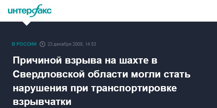 Москва. 23 декабря. INTERFAX.RU - По предварительным данным МЧС, ко взрыву на шахте Естюнинская ОАО "Высокогорский ГОК" (Нижний Тагил, Свердловская область, входит в Evraz Group), могли привести нарушения правил транспортировки взрывчатки.