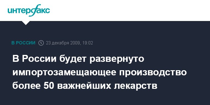Москва. 23 декабря. INTERFAX.RU – В России появятся более 50 наименований стратегически значимых лекарств отечественного производства, заменяющих зарубежные аналоги.