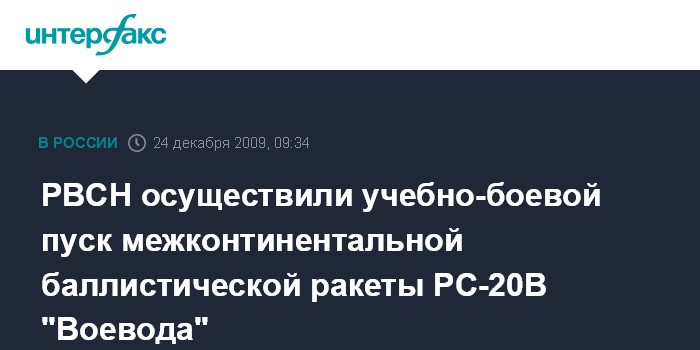 Москва. 23 декабря. INTERFAX.RU – Из позиционного района Домбаровской дивизии Ракетных войск стратегического назначения (РВСН) (Оренбургская область) в четверг осуществлен учебно-боевой пуск межконтинентальной баллистической ракеты РС-20В "Воевода", сообщил "Интерфаксу-АВН" пресс-секретарь управления пресс-службы и информации Минобороны РФ по РВСН полковник Вадим Коваль.