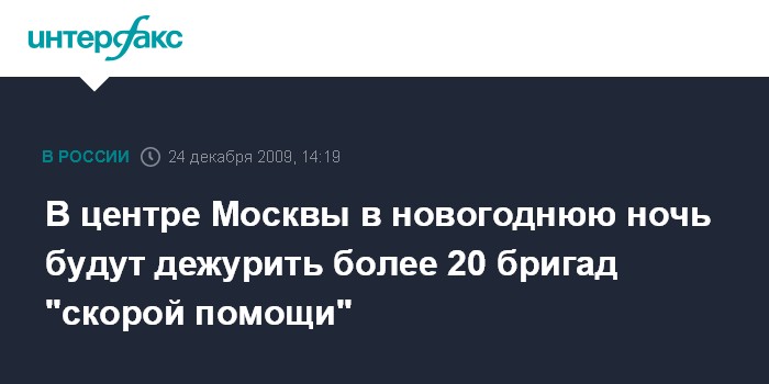 Москва. 24 декабря. INTERFAX.RU - Более 20 бригад "скорой помощи" будут нести дежурство на центральных праздничных площадках Москвы в новогоднюю ночь, сообщили "Интерфаксу" в департаменте здравоохранения города в четверг. "В новогоднюю ночь в центре города, где запланировано проведение праздничных мероприятий на Манежной, Тверской, Пушкинской, Лубянской площадях, Васильевском спуске и Красной площади, будет организовано дежурство более 20 бригад "скорой помощи", - сказал собеседник агентства. Он отметил, что более 30 бригад скорой медицинской помощи будут нести дежурства на окружных праздничных площадках.