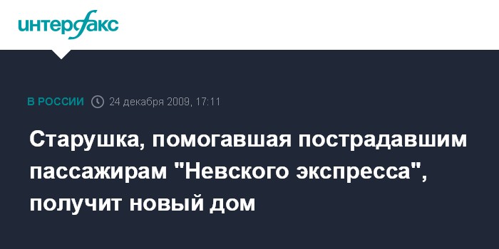 Москва. 24 декабря. INTERFAX.RU - Пенсионерке, оказавшей помощь пострадавшим пассажирам "Невского экспресса", строят новый дом, сообщил глава ОАО "РЖД" Владимир Якунин на встрече с премьер-министром РФ Владимиром Путиным. В ходе встречи премьер напомнил о том, что вопрос о судьбе этой старушки был задан ему во время общения с россиянами в прямом эфире в программе "Разговор с Владимиром Путиным". "Я вас просил сделать все, чтобы создать для нее достойные условия жизни", - сказал Путин. В ответ Якунин продемонстрировал официальные документы о том, что сделано по поручению премьера, и показал ему фотографию строящегося дома.