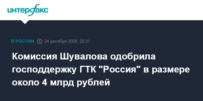 Москва. 24 декабря. INTERFAX.RU - Комиссия по обеспечению устойчивого развития российской экономики под председательством первого вице-премьера РФ Игоря Шувалова в четверг одобрила предоставление господдержки ГТК "Россия" в размере около 4 млрд рублей, сообщили "Интерфаксу" источники, близкие к компании. Средства будут выделены ГТК "Россия" из бюджета напрямую, сказал один из собеседников агентства.