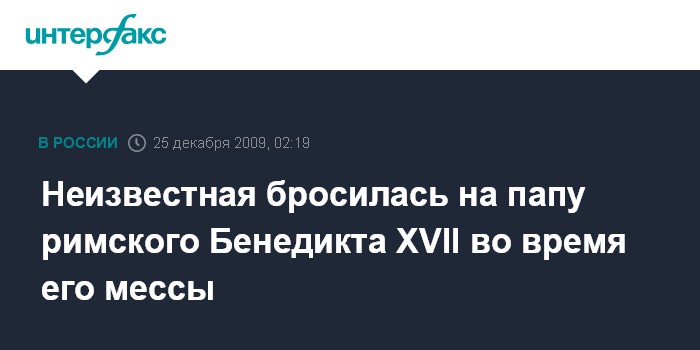 Москва. 25 декабря. ИНТЕРФАКС - В Ватикане едва не сорвалась Рождественская месса. Перед самым началом ночной службы на папу римского Бенедикта XVII бросилась неизвестная, после чего понтифик упал, передает телеканал "Вести-24".