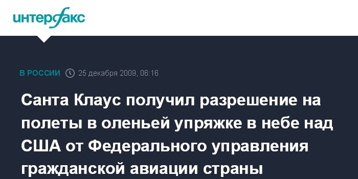 Вашингтон. 25 декабря. ИНТЕРФАКС - Руководитель Федерального управления гражданской авиации США (FAA) Рэнди Бэббитт дал Санта Клаусу разрешение на полет его саней в воздушном пространстве США, сообщается на сайте FAA.