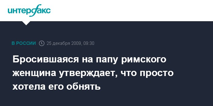 Москва. 25 декабря. INTERFAX.RU - Женщина, бросившаяся на папу римского Бенедикта XVI во время Рождественской мессы, заявила стражам порядка, что хотела лишь обнять понтифика, информирует в пятницу газета "Коррьере делла сера".