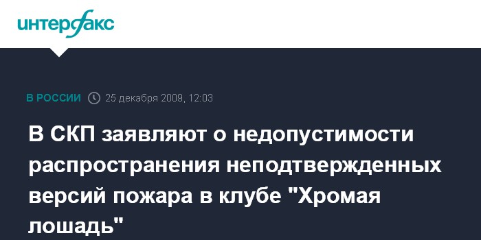 Москва. 25 декабря. INTERFAX.RU – Следственный комитет при прокуратуре (СКП) РФ предупреждает о неправомерности распространения в СМИ всевозможных, неподтвержденных следствием версий причин пожара в ночном клубе Перми.