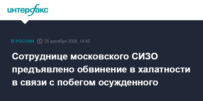 Москва. 25 декабря. INTERFAX.RU - Следственное управление СКП РФ по Москве завершило расследование дела по факту побега осужденного, который был совершен 19 августа 2009 года из ФБУ ИЗ-77/4, заявляют в СКП РФ по Москве. Как говорится в сообщении СКП РФ по Москве, поступившем в "Интерфакс" в пятницу, следствием установлено, что "побег произошел в результате недобросовестного исполнения младшим инспектором второй категории внутренней службы своих должностных обязанностей".