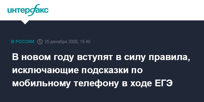 Москва. 25 декабря. INTERFAX.RU - Рособрнадзор разработает нормы, направленные на предотвращение использования мобильных телефонов во время сдачи Единого государственного экзамена, сообщила глава ведомства Любовь Глебова. "В решении комиссии (Комиссия при президенте РФ по совершенствованию проведения ЕГЭ - ИФ) у нас есть поручение, чтобы установить все правила, регулирующие невозможность использования мобильных телефонов", - сказала Глебова на пресс-конференции в центральном офисе "Интерфакса" в пятницу. По ее словам, будут разработаны нормы, определяющие ответственность лиц, допустивших использование мобильника на экзамене, меры, позволяющие предотвратить попадание мобильных телефонов в аудиторию, где проводится ЕГЭ, и другие нормы.