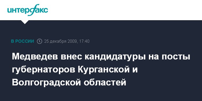 Медведев внес кандидатуры на посты губернаторов Курганской и Волгоградской областей