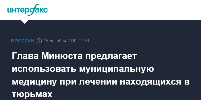 Москва. 25 декабря. INTERFAX.RU - Министерство юстиции РФ и Генпрокуратура провели проверки, которые были направлены на то, чтобы "выявить причины и обстоятельства трагического происшествия в одной из тюрем в Москве в нынешнем году", сообщил на встрече с президентом РФ в пятницу глава Минюста Александр Коновалов. "ФСИН проводит анализ качества и практики медицинских сервисов. Не исключено, что здесь необходимо применять определенную форму аутсортинга и использовать муниципальную медицину, по крайней мере, в тех случаях, когда это доступно", - сказал глава Минюста.