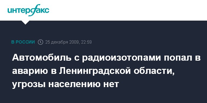 Санкт-Петербург. 24 декабря. ИНТЕРФАКС-СЕВЕРО ЗАПАД - Грузовой автомобиль, перевозящий материалы, содержащие радиоактивные изотопы, попал в дорожно-транспортное происшествие в Ленинградской области.