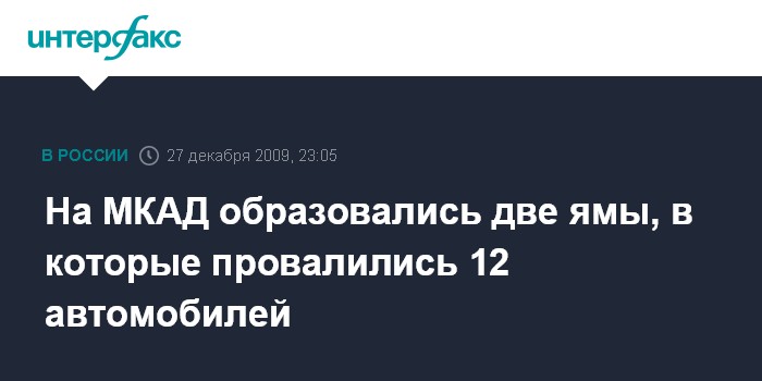 Москва. 27 декабря. ИНТЕРФАКС-МОСКВА - Разрушение дорожного покрытия на Московской кольцевой автодороге стало причиной повреждения двенадцати автомобилей.