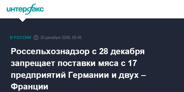 Москва. 28 декабря. ИНТЕРФАКС - Россельхознадзора с 28 декабря запрещает поставки мяса с 17 предприятий Германии и двух - Франции.