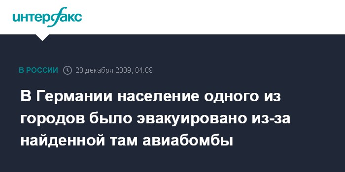 Москва. 28 декабря. ИНТЕРФАКС - Администрация города Вехте (Германия) приняла решение эвакуировать всех жителей города из-за найденной там американской авиационной бомбы времен Второй мировой войны, сообщает телеканал "Вести-24" со ссылкой на данные газеты "Bild".