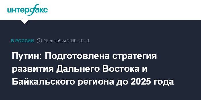Москва. 28 декабря. INTERFAX.RU – Подготовлена Стратегия развития Дальнего Востока и Байкальского региона до 2025 года, сообщил премьер РФ Владимир Путин.