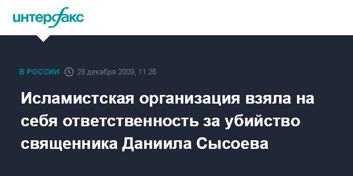 Москва. 28 декабря. INTERFAX.RU – Организация "Информационно-аналитический отдел штаба Вооруженных сил вилайята Ингушетия имарата Кавказ" утверждает, что убийство православного священника Даниила Сысоева совершил один из ее активистов за то, что священнослужитель поносил ислам.