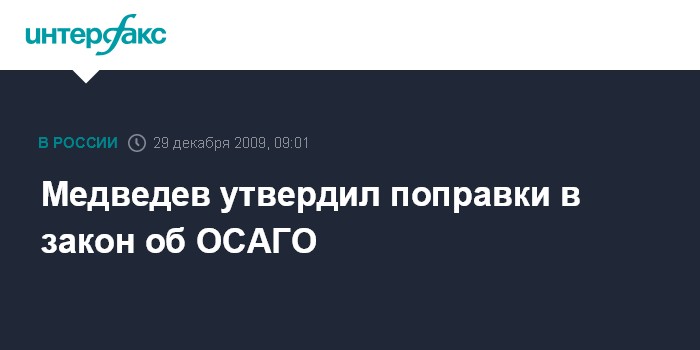 Москва. 29 декабря. INTERFAX.RU – Президент России Дмитрий Медведев подписал федеральный закон "О внесении изменений в статью 27 Федерального закона "Об обязательном страховании гражданской ответственности владельцев транспортных средств", сообщает пресс-служба главы государства.