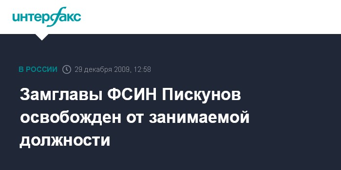 Москва. 29 декабря. INTERFAX.RU - Президент России Дмитрий Медведев освободил от должности заместителя директора ФСИН генерал-лейтенанта внутренней службы Александра Пискунова. Соответствующий указ главы государства опубликован во вторник на официальном сайте Кремля.