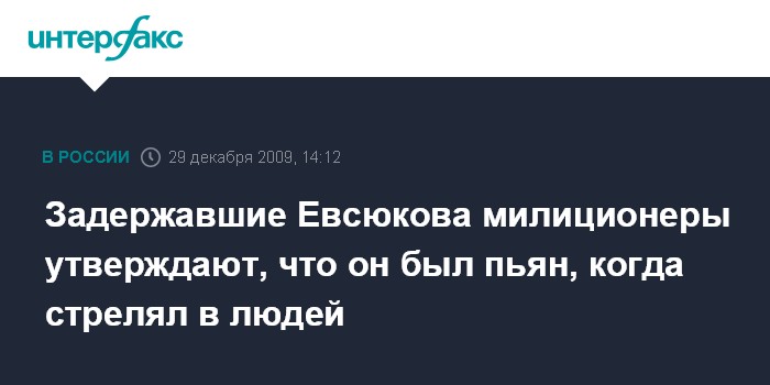 Москва. 29 декабря. INTERFAX.RU - Милиционеры, участвовавшие в задержании майора милиции Д.Евсюкова, устроившего стрельбу в одном из супермаркетов Москвы, на заседании во вторник в Мосгорсуде заявили, что он был пьян в момент задержания, передает корреспондент "Интерфакса". они также отметили, что пистолет Д.Евсюкова после задержания никто не трогал.