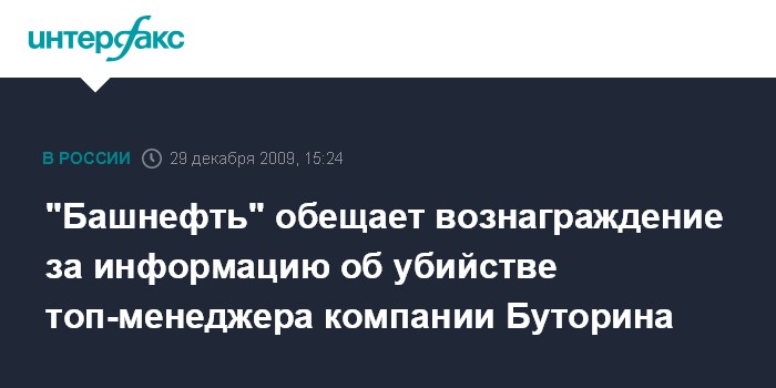 Москва. 29 декабря. INTERFAX.RU - ОАО АНК "Башнефть" объявила о вознаграждении в 100 тыс. рублей тому, кто сообщит информацию по убийству директора департамента экономической безопасности "Башнефти" Владимира Буторина.