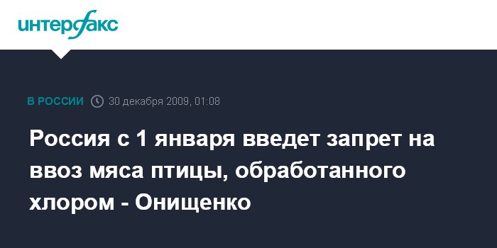Ранее Г.Онищенко заявил "Интерфаксу", что нормы, предполагающие снижение использования хлора при обработке птицы, должны были вступить в силу в России 1 января 2009 года, но были отложены при условии, что американские производители в течение этого года обсудят с российскими специалистами соблюдение нормативов.