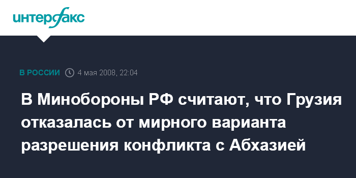Москва. 4 мая. ИНТЕРФАКС - В министерстве обороны России называют инцидент с двумя грузинскими самолетами-разведчиками провокационным и свидетельствующим о том, что для Тбилиси не существует мирного варианта разрешения грузино-абхазского конфликта.